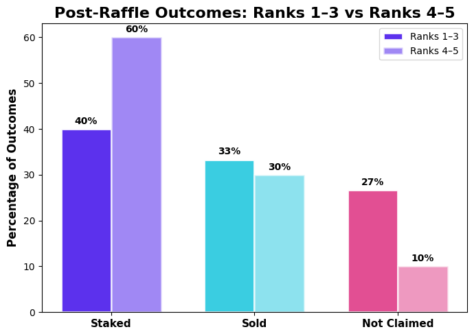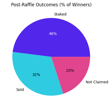 When comparing post-raffle behavior by winner rank (prize tier), a difference emerges. First place outcomes are more polarized, with staking and selling occurring at similar rates. Taken together, these charts suggest that larger prizes introduce more variability in post-win behavior, while smaller prizes correlate with steadier participation with a higher tendency to stake and a lower tendency to sell..Heres the data ![]()