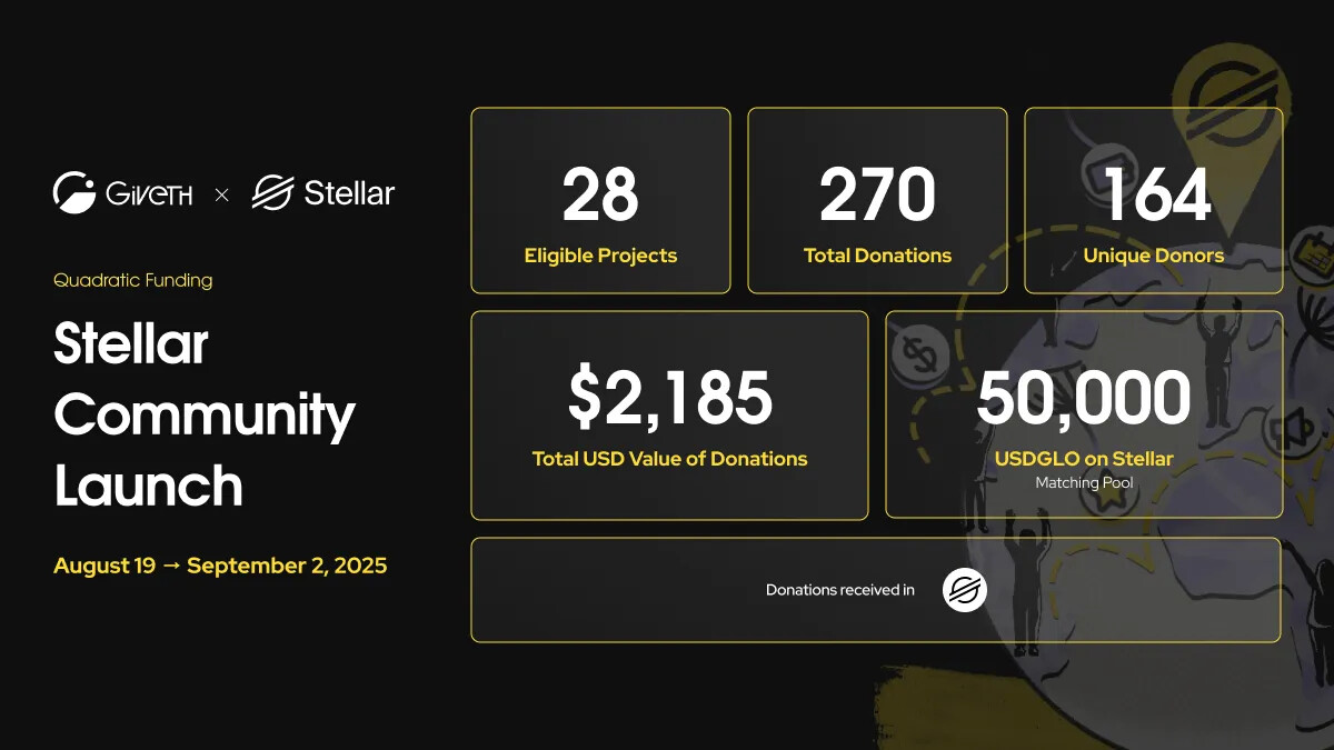 This round was designed to spotlight emerging leaders bringing Stellar to new audiences through local events, workshops, hackathons, and educational initiatives. With a 50,000 USDGLO matching pool funded by the Stellar Development Foundation, this round set out to empower projects creating meaningful Stellar-aligned experiences around the world.